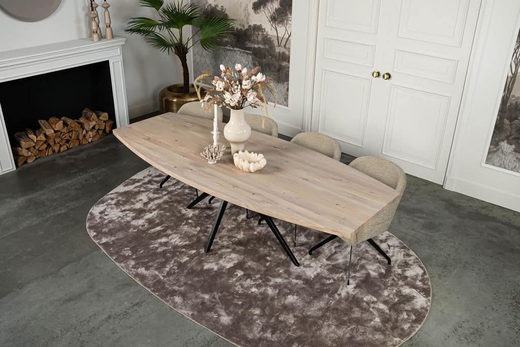 Die halbovale Form macht den Tisch nicht nur zu einem echten Hingucker, sondern auch äußerst praktisch. Die sanften Rundungen sorgen für eine einladende Atmosphäre und maximieren den Sitzkomfort – ideal für gemütliche Abendessen und lange Gespräche. Dank der cleveren Gestaltung passt dieser Tisch sowohl in kleinere als auch größere Esszimmer perfekt.