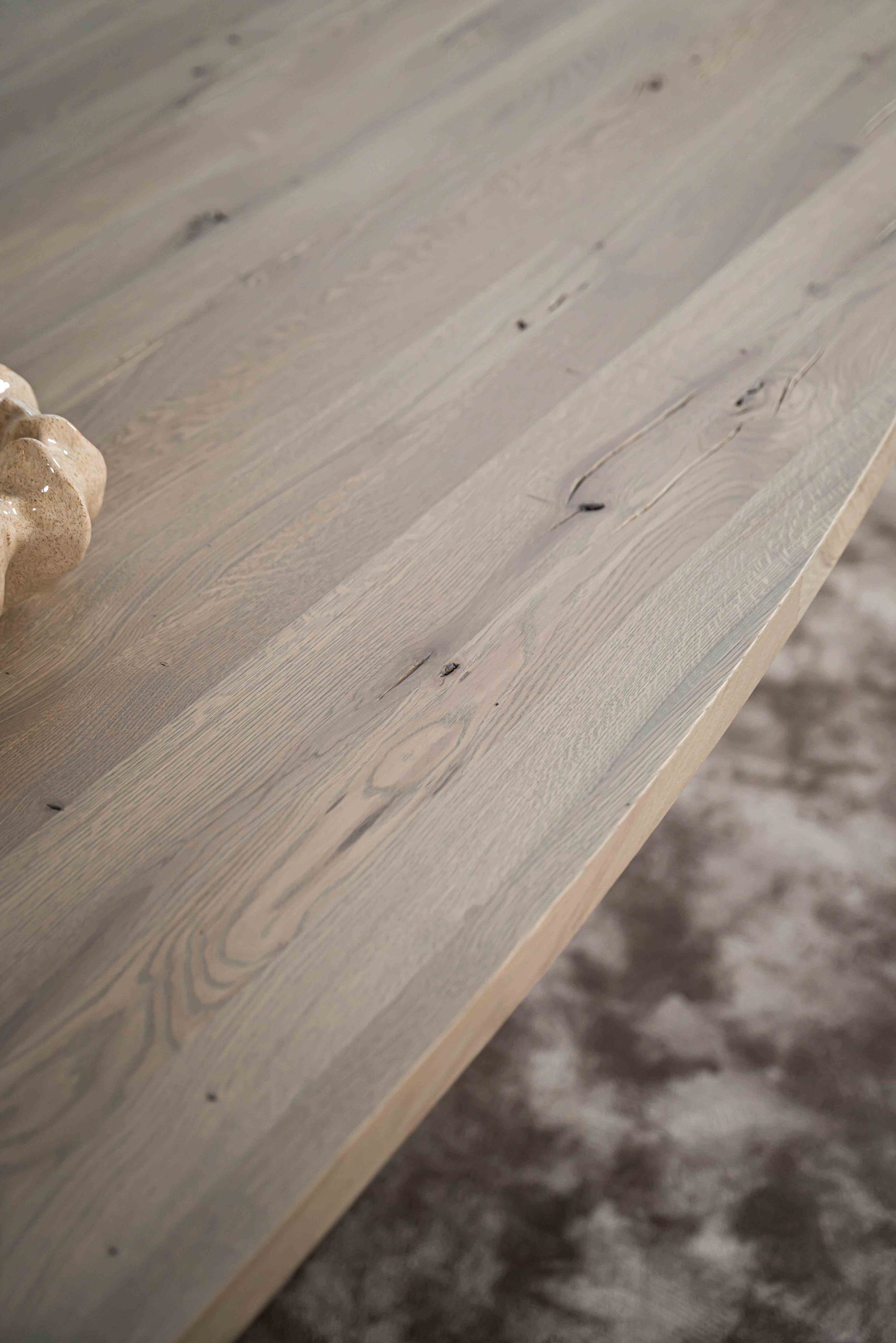 Der Tisch wird aus massivem Eichenholz gefertigt, einem natürlichen und robusten Material, das für seine lange Lebensdauer bekannt ist. Die sichtbare Holzmaserung verleiht jedem Exemplar eine einzigartige und authentische Ausstrahlung. Die hochwertige Lack- oder Ölbehandlung schützt die Oberfläche vor Flecken und Abnutzung, sodass Sie jahrelang Freude an diesem wunderschönen Tisch haben werden.