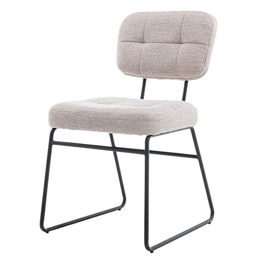 Der Esszimmerstuhl Padola ist ein moderner Stuhl, der perfekt in eine moderne und industrielle Einrichtung passt. Er hat ein rundes, schwarzes Metallgestell. Gepolstert mit alpinem Bouclé-Stoff in verschiedenen Farben.